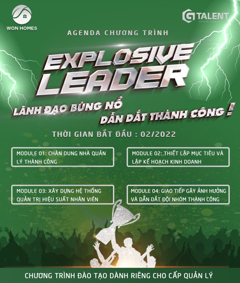 Sự kết hợp giữa đơn vị đào tạo Top 1 trên thị trường BĐS – Học Viện G-Talent, Doanh nghiệp BĐS nổi bật khu vực phía Tây Hà Nội hứa hẹn sẽ là sự kiện đầy bùng nổ và truyền cảm hứng tới tất cả các chiến binh Won Homes. Cùng đón chờ chương trình “Lãnh đạo bùng nổ – dẫn dắt thành công” – Chương trình đào tạo CHUYÊN NGHIỆP dành cho tất cả những Nhà lãnh đạo khai phóng của Won Homes.